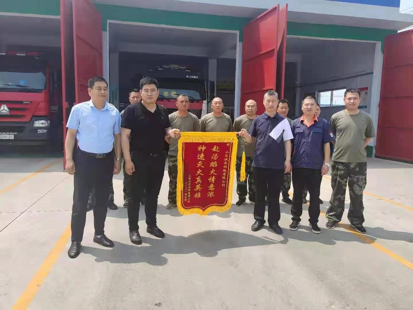 山東億爾化學(xué)為我公司消防隊送來錦旗發(fā)布時間:2021-07-13 14:516月 2日上午,我公司安全總監(jiān)王艷彬、護(hù)衛(wèi)隊主任顏丙凱代表公司收到了山東億爾化學(xué)公司贈送的印有“赴湯蹈火情意濃,神速滅火真英雄”的一面錦旗,億爾化學(xué)安全負(fù)責(zé)人對在5月29日火災(zāi)撲救中快速出警、處置正確、不畏危險、英勇作戰(zhàn)的濱農(nóng)科技消防隊指戰(zhàn)員表示衷心的感謝。王總和顏主任表示,一旦有險情發(fā)生,快速實現(xiàn)應(yīng)急救援和全力保護(hù)園區(qū)消防安全是濱農(nóng)消防隊?wèi)?yīng)盡的職責(zé),錦旗是對我們工作的肯定,也是對濱農(nóng)消防隊莫大的鼓舞,今后將一如既往地為濱北工業(yè)園區(qū)創(chuàng)造平安、和諧、穩(wěn)定的安全環(huán)境。 ![]() |