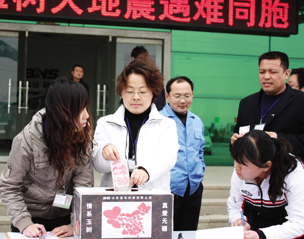 4·14青海玉樹地震發(fā)生后,我公司全體干部員工十分關(guān)注來(lái)自災(zāi)區(qū)的一切消息。4月21日上午10時(shí),值此全國(guó)哀悼日,我公司黨總支、工會(huì)組織了“情系玉樹,真愛無(wú)疆”自愿捐款活動(dòng),集團(tuán)董事長(zhǎng)黃延昌、總經(jīng)理任立明率先捐款,全體高中層干部在辦公樓前參加了集體捐款活動(dòng)。集團(tuán)公司各部門、車間員工也紛紛自發(fā)捐款,集中將善款交到了企業(yè)文化部。活動(dòng)結(jié)束后,累計(jì)捐款近五萬(wàn)元,這批善款將用于馳援災(zāi)區(qū)同胞抗震救災(zāi),重建家園。