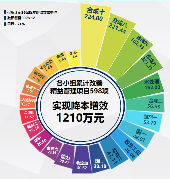 全年共計87個車間(部門)參與精益改善,濱州與沾化基地共評價改善項目598項,降本增效約1200余萬元。甘肅基地提交改善項目158項,降本增效551萬元。公司為鼓勵各系統(tǒng)參與改善,促使產(chǎn)品增值并快速實現(xiàn)產(chǎn)品價值、組織增效,共發(fā)放激勵基金58330元。各分管副總分別就2024年卓越推進工作做了詳細要求,要求各改善團隊展開改善項目盤點工作,借鑒優(yōu)秀,對標持續(xù)改善,筑牢基礎管理工作。持續(xù)提質(zhì)提效,降工降費,節(jié)能減排;持續(xù)三化融合,使人機配合更高效,精益數(shù)字高賦能。細化績效指標分解工作,將改善項目與部門績效、公司經(jīng)營目標有效銜接。結(jié)合全年各改善團隊參與情況及改善績效,以及各系統(tǒng)分管領(lǐng)導評定,公司評選出四個年度優(yōu)秀精益改善團隊:制劑一車間、國一車間、合成七車間、危廢處理車間。