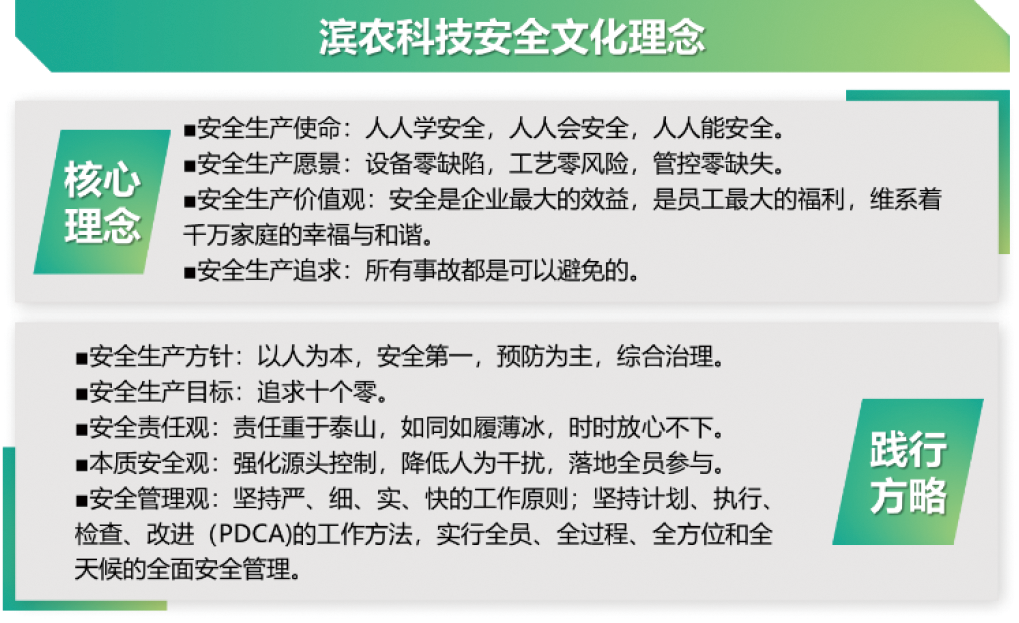 《安全文化手冊》由集團(tuán)培訓(xùn)及企業(yè)文化部主導(dǎo)編寫,共分“5篇、21節(jié)、2談、1倡議”,從領(lǐng)導(dǎo)作用到理念系統(tǒng)、制度保障、員工行為、環(huán)境建設(shè),全面梳理構(gòu)建起了1.0版的濱農(nóng)科技安全文化體系,為公司實(shí)現(xiàn)“全員、全過程、全方位、全天候”的全面安全管理奠定文化基石,為激發(fā)全員參與的信念和行動(dòng)樹起文化旗幟,明確公司零事故的管理追求,梳理實(shí)現(xiàn)零事故的管理方法。